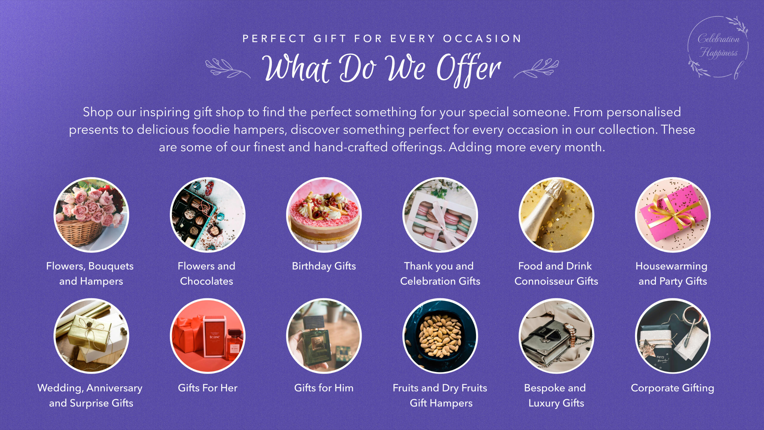 Welcome to Celebration Of Happiness, where luxury gifting meets celebration. With a focus on bespoke gifting, we curate an exquisite variety of luxurious presents, from fresh flowers and gourmet cakes to artisanal chocolate bouquets and bespoke gift hampers. Our collection is designed to elevate every occasion and festival with elegance and style.We are dedicated to delivering the pinnacle of quality and tailored service. Each product is hand-crafted to ensure the essence of luxury, making us the leading choice for selective individuals seeking refined gifts for birthdays, weddings, anniversaries, any special occasion and corporate gifts.Elevate your gifting experience with us, where we offer an unparalleled selection of perfectly crafted bespoke luxurious gifts.